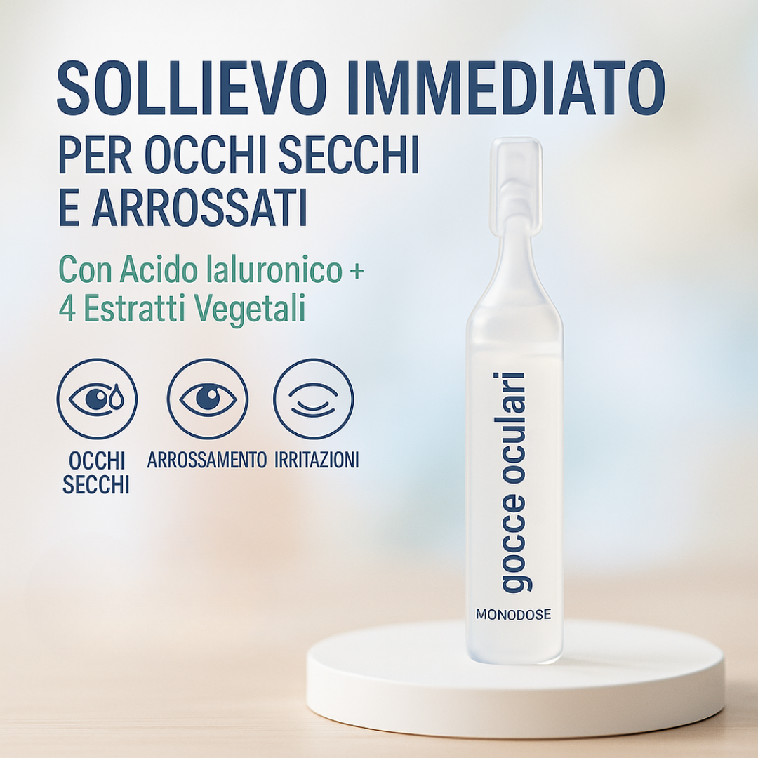 Collirio occhi secchi con acido ialuronico e camomilla: idratazione intensa e sollievo immediato contro secchezza, rossore, affaticamento visivo e allergie stagionali.