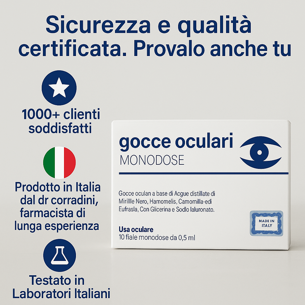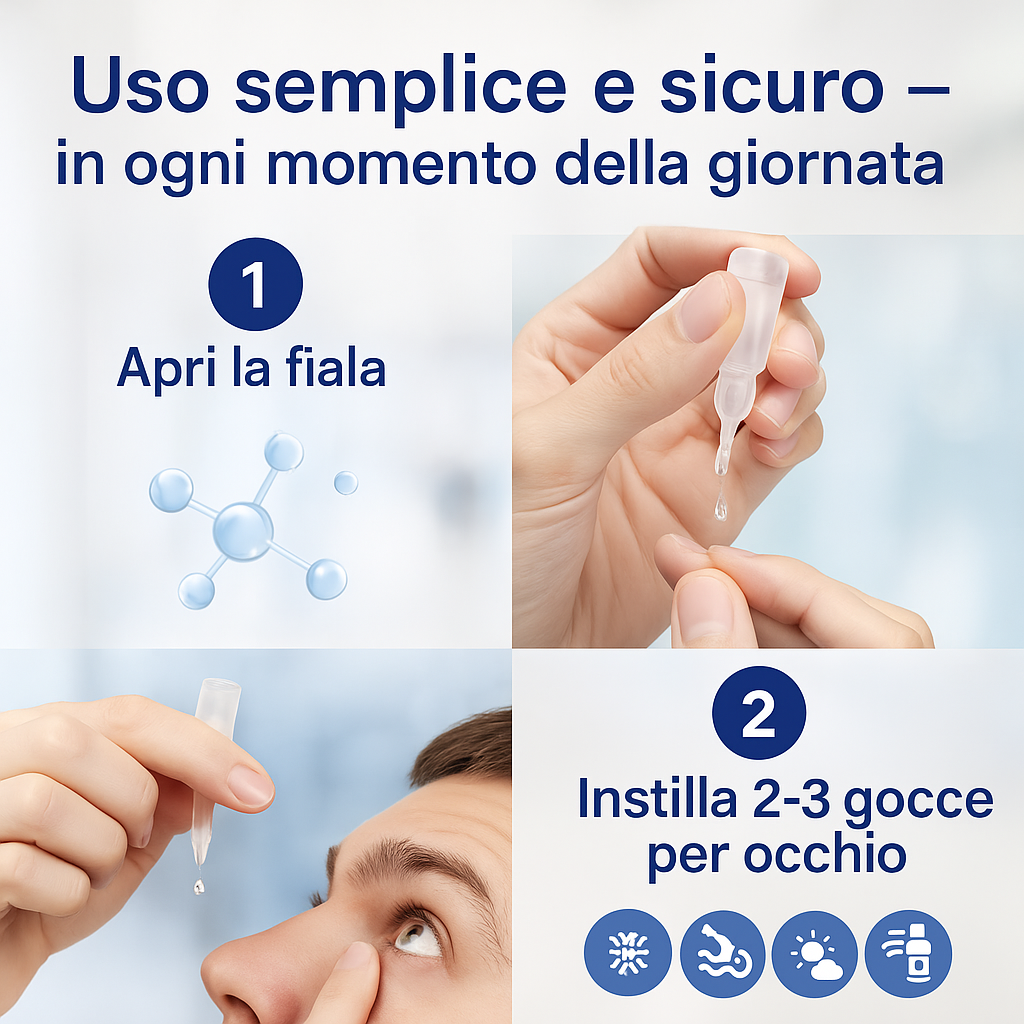 - FORMATO MONODOSE STERILE E SICURO Ogni fiala è confezionata singolarmente, garantendo igiene e praticità. La formula è priva di conservanti, adatta anche a occhi particolarmente sensibili.